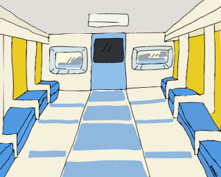 | 折りたたんでるマットとマットの上で滑りまくる敷物(どっちも青色)。 折りたたんだ状態で使うのか、伸ばすのか不明な枕風のクッション(青色)。 ビニール袋に包まれ、「洗濯してます、清潔です」の毛布(茶色)一枚で、一人分。 |