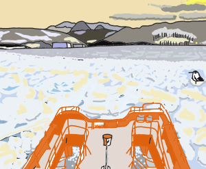 | ガリンコ号のドリル、大活躍でございます ガリガリ ゴリゴリ ギュ~ン バリバリ の様な音響かせながら、ガンガン進んでいきます 流氷だらけやからね、遠く行く必要ないのんね 港の先の辺で、大きくぐるぐる |
