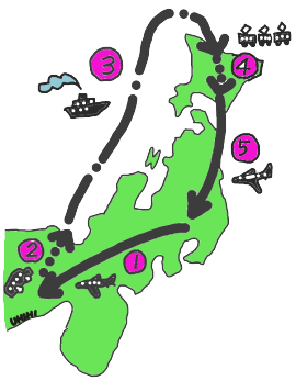 | 計画はこんな感じ 水曜日 : 羽田空港 ~ 神戸空港 三ノ宮 ~ 舞鶴 木曜日 : ~ 小樽 金曜日 : 新千歳空港 ~ 羽田空港 |