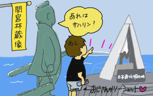 | はるかサハリンを望見している、間宮林蔵さん 同じポーズ(半袖半ズボン)で、2ショット |