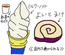 | 無料の紅茶を戴きながら、“よいとまけ”と“ソフトクリーム” “よいとまけ”がお気に召したオクサマ ペットシッターのお姉ちゃん用と、自宅用にお土産お土産 |