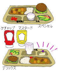 | 注文したのは ワシ:デラックスプレート カレー・クウォーターバーガー・チーズケーキ・サラダ・牛乳・福神漬 オクサマ:スペシャルプレート カレー・クウォーターバーガー・サラダ・牛乳・福神漬 |