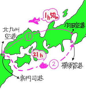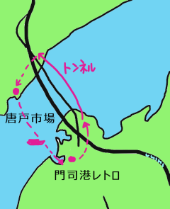 55m上って、道路渡ったところからバス 10分ほど、バスを待って 10分ほど、バスに乗って 5分ほど、関門連絡船で、門司港 |