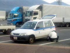 「左前輪タイヤがパンクしている様なので、次の奥屋PAで修理を行います」、やって。