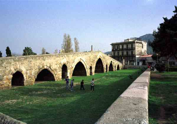 最初に建てられていた頃には、この下にちゃんと川(オレート川:現在はやや北側を流れている)があったらしい。後に川の流れが変わり、橋だけが残った。今は公園になっている。