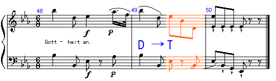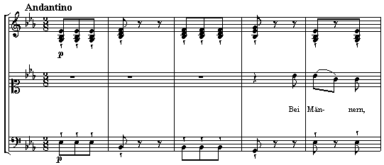 モーツァルトにとって単純な3/8拍子や、そして単純な繰り返し拍子グループ形成は、あきらかに、いずれにせよ、ここで見た作品において、拍節上の拍子グループ形成を持った6/8拍子とは作曲法上異なったヒェラルキーに位置付けられている。二重唱の経過部に続く「男と女、女と男(Mann und Weib und Weib und Mann)」にて動きが3/8拍子と6/8拍子の間を揺れるように見える。そのときしかし、そこで、パートナーの一人、すなわち女王の娘パミーナが「神(Gottheit)」の言葉を目前にして、また「神に至る(reichen an die Gottheit an)」の発言の豊かな自覚において、我を忘れて音楽的にいわば突然感情を爆発させる。この瞬間に、動きは「より高い」6/8拍子においてもはや単なる単純な繰り返しではなくて拍節法に規定された拍子グループ構築法により安定化する。パパゲーノはそれに反し、3/8拍子のまま、その単純な繰り返しのまま取り残される。