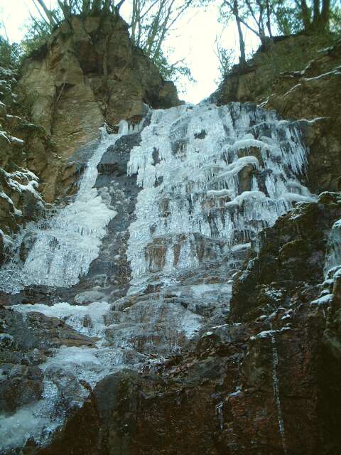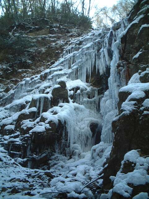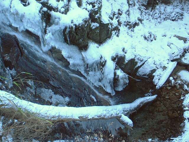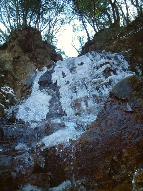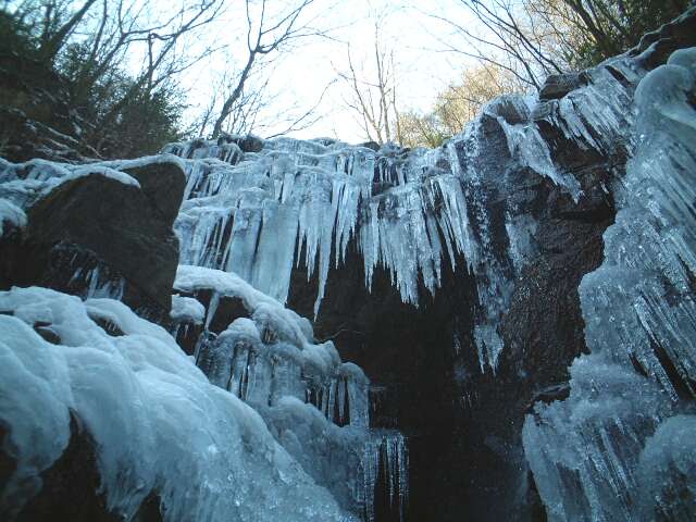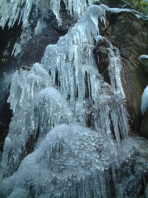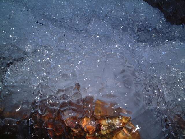 滝の下には、たくさんの半球状の氷がありました(ストロボ使用)