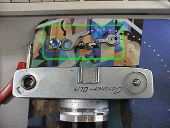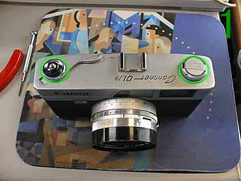 こちらは、ボディ編になります。レンズ編に比べると簡単に作業が出来ます。まずトップカバーの外しかたです。写真1の緑部分の巻き上げレバーと巻き戻しクランクを外します。巻き上げレバーは、QL19の場合カニ目がありませんのですぺりどめゴムなので銀色部分を回してあげると簡単に外れます。巻き戻しクランクは、フィルム室に出ているクランク下部にドライバーなどをはめて回してあげると外れます。右の写真の緑部分に外れた1式のパーツが見えます。あとはボディについている3個所のネジを外すとトップカバーが外れます。 | ![]() |