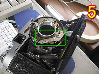 写真3は、トップカバーをあけた上部から撮影したものです。この時代のカメラは部品数も少ないのですが1つ1つの部品のしっかりと役割があるので分解は非常にしやすいです。 写真4は、シャッターカバーを外したところです。非常にシンプルなシャッターなんですが部品1つ1つの精度は低い様に思われます。部品成形も雑な部分が多く見られます。 |