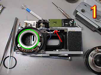 今回は、ペトリらしい個性の強いカメラであるプレストの分解です。実際の作業は非常に手間がかかっていたのですが写真の撮り忘れで写真数が少なくなってしまいました。写真1は、各ブロックごとに分解したところです。ペトリらしく各部品の作りは大柄に思えます。緑丸は巻き上げレバーからシャッターチャージへのリンクを行うリングです。前のペトリ35の時同様に鏡胴を押さえつけているリングがだんだん使っていくうちに動いてきてしまいシャッターチャージができなくなってしまうことが多いです。ペトリの故障品を見たらまずそこを疑ったほうが良いと思います。赤矢印は普通ならば巻き上げレバーからのリンクがあるのですがこのカメラは写真2の赤矢印のように底部巻き上げの為、距離計調節の為のレバーのみ付いています。写真には無いのですが底部巻き上げの部品は1時代前カメラのように大柄で精度も低く非常に壊れやすいと思います。写真3はシャッター部を反対から見たところです。赤矢印部分がシャッターチャージの為のリングです。私が分解してみて思うには、各部品の精度、構造的に見てもかなりのリコールがあったように思えます。カメラと見ればあまり良いカメラではありませんがスタイル、ペトリのチャレンジングスピリットの感じるカメラで私は非常に好きなカメラの1台です。 | ![]() |