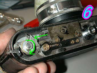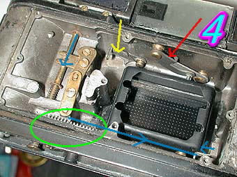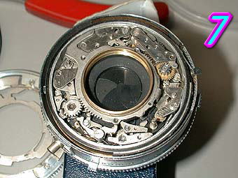今回は、アイレスの美しいカメラレーダーアイの分解です。個人的には非常に好きなカメラです。外見的にはライカMシリーズに似ているような気がします。今回の修理が原因がわからずに少々苦労しました。セイコーシャSLSシャッターとボディのリンクがわかるようになったとき答えが出てきて修理方法がわかりました。 写真1は、鏡胴ブロック、トップカバーを外したところです。こう見ると非常にM型ライカに似ていると思います。各機能に対しては2〜8で述べていきたいと思います。 写真2の緑矢印は露出計へのリンクになります。SLSシャッターの棒(写真8)が緑丸にはまってメーターブロックを動かし指針を動かします。赤矢印はシャッターボタンのリンクになります。 写真3は、シャッターチャージのリンクになります。こちらもSLSの棒(写真8)が緑丸部分にはまり矢印のギアにより回転されてシャッターがチャージされます。今回のトラブルはこのギアのかみ合わせ位置の不良によりシャッターが切れなくなっていました。 写真4は、少々複雑になっていますので色矢印で解説します。まず緑丸部分がシャッターチャージ用のギアの回転させる為にのこぎり状なっています。写真6の平行移動をギアの回転に変換しています。青矢印はシャッターボタンへのリンクになります。シャッターボタンが押されるとフィルム室下部を通り逆面にリンクされシャッター本体のシャッター開閉ピンに行くようになっています。左面にスペースが無くなってしまったので苦肉の策であったように思えます。黄色矢印はメーター指針を動かす為のピンです。メーター指針を動かすというよりはメーター本体を動かしています。赤矢印は距離計像を動かすピンになっています。 写真5はトップカバーを外した状態を見たところです。非常に効率良く各パーツが配置されております。いかに露出計をいれるのに苦労した後が見られます。 写真6は、アンダーカバーを外したところです。巻き上げレバーを回すことにより緑矢印方向に回転してリンクしているのこぎり状(写真4)のパーツへリンクしています。 写真7は特徴の多いセイコーシャSLSシャッター内部です。構造は非常に複雑で分解すると組み上げるのになかなか手間がかかります。 写真8はSLSシャッターの裏面になります。このシャッターの特徴である3本足が生えています。セイコーシャの中でもこの形態のものは見たことがありません。当然他のシャッターメーカーに関してもです。露出計に連動させたシャッターも非常に珍しいと思います。緑矢印部分がシャッターボタンにリンクするシャッター開閉用の足、赤矢印が露出計に連動する足、黄色矢印がシャッターチャージ用の足になります。 最後にSLSシャッターのおかげで露出計連動、柔らかい巻き上げ、ソフトなシャッターボタンが再現されたカメラであると思います。よく考えるとアイレスと言うメーカーはライカを非常に意識していたように思えてしょうがありません。 |