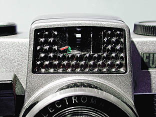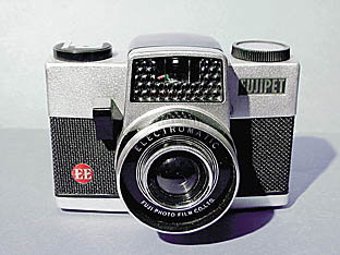 | 大ヒットであったフジペットに露出計ののせてEE撮影が出来るようにしたのがこのフジペットEEである。EEの構造は非常にシンプルでメーター部に勾玉型絞りが直接付けてあり その振れかたにより絞りを調節するというものであった。分解してみると部品数も少なく、非常に良く出来たカメラであると思う。中古市場では、結構高値で販売されている。メーターが壊れていると1/60 F11でしか使えないので購入の際はメーターは確認する必要がある。 |