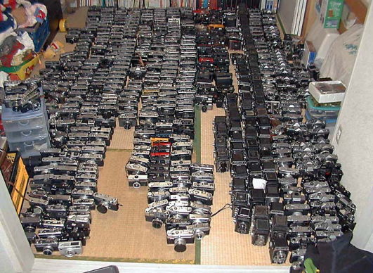 しばらくお正月休みを取らせて頂きましたので更新が遅れてしまいまして非常にすいませんでした。今年も年末恒例の大掃除を決行しました。カメラの台数もかなり増え24時間(徹夜)でカメラの大掃除をおこないました。写真の方は今整理棚に保存してあったカメラ達です。去年だけで約350台ほどカメラが増えました。列ごとにメーカーの種類わけがしてあります。この写真を見て機種名がわかったらかなりのカメラ通(おたく?)ですか.写真に写っている以外にも約600台ほど整理されていないものがあります。(年が明けてから整理しました。)しかしよくここまでカメラが増えたものだと本人もあきれています。 新世紀になりましたがまだ懲りずにカメラを修理して楽しみながらカメラの台数を増やしていきたいと思っております。カメラの辞典をこのHPで完成させたいと思っております。今後ともよろしくお願いします。 |