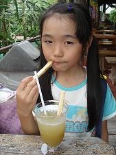 さとうきびジュースをおしゃぶり 甘い、甘い。 |