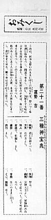 その後の運勢が変わってくるそうです。吉凶だけでなく、内容も楽しみましょう。 「三種神宝兆」というのが、妙にありがたげに感じます。ここのおみくじの文言は、 『古事記』から取っているそうです。 『日本おみくじ紀行』という本に紹介されているものでは、 「…兆」の次に一行の漢文(これも『古事記』から)がありますが、 私の引いたものにはありません。逆に、「病気」等の項目別の運勢書きは、 本には紹介されていません。最近、形式が変わったのかもしれません。 |