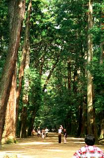 拝殿前から東神門を通り奥宮に向う奥参道は、鬱蒼とした森に囲まれ厳かな雰囲気です。