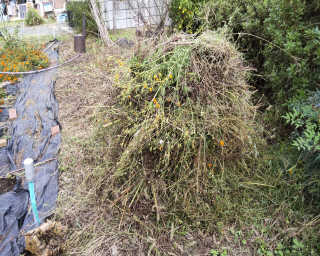 刈った草、野菜を片付けた茎蔓等なんでも畑kの隅に積んで置いて堆肥に利用する。