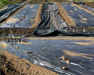 キタアカリ、アンデスレッドの両方とも種芋に出ていた芽は下にして植えた。