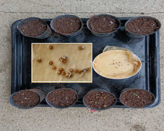 食卓に水を含ませたキッチンペパーを敷いたお皿の上にミニトマトの種を置いて