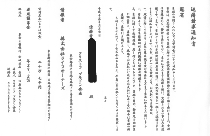 クリストフブルドン企画と株式会社ライフオーナーズからも、下の返済請求通知書をいただきました。
