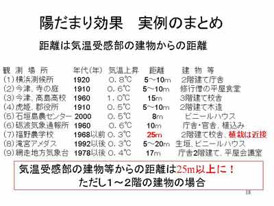 | (18/42) これまでに判った陽だまり効果の 一覧を掲げた。表の(7)福野農学校は2階建て校舎から25m離れて百葉箱が 設置されて、理想的であった。しかし、当時の露場周辺には、つつじの植栽と 背丈の高い樹木があり、それらによる陽だまり効果で年平均気温が0.3℃ほど 高めに観測されていた。 | ![]() |