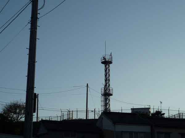 今回、風観測の代表点としての観測所の特徴を評価したく、周辺を車で広く回りました。 広域的な風の代表点として考える場合、北西から西の風向に対しては、海風として 良いデータを得ることができると思います。しかし、接地層の気流のような下層大気 のデータを収集するためには、風速計の設置高度が高く、更に敷地が丘の上であること、 敷地全体が小規模で複雑な地形に囲まれていて、十分な観測環境ではないと思いました。 丘の下から見た観測所の環境を、図14.2に示しました。
