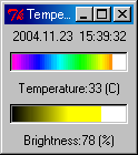 #!/usr/local/bin/perl #--------------------------------------------------------------- # PICNIC温度・照度計 # 2004.11.23 nakamura #--------------------------------------------------------------- use LWP::Simple; use Tk; use Tk::ProgressBar; @color_tbl = ( 0, '#ff00d9', 1, '#ff00f3', 2, '#e900ff', 3, '#d400ff', 4, '#ae00ff', 5, '#9900ff', 6, '#8300ff', 7, '#5d00ff', 8, '#4800ff', 9, '#2800ff', 10, '#1200ff', 11, '#0008ff', 12, '#0028ff', 13, '#003eff', 14, '#0063ff', 15, '#0079ff', 16, '#008eff', 17, '#00b4ff', 18, '#00c9ff', 19, '#00eaff', 20, '#00fff8', 21, '#00ffe3', 22, '#00ffc3', 23, '#00ffa8', 24, '#00ff87', 25, '#00ff72', 26, '#00ff57', 27, '#00ff37', 28, '#00ff21', 29, '#03ff00', 30, '#19ff00', 31, '#2eff00', 32, '#54ff00', 33, '#6aff00', 34, '#8aff00', 35, '#9fff00', 36, '#baff00', 37, '#dbff00', 38, '#f0ff00', 39, '#ffe700', 40, '#ffd200', 41, '#ffbc00', 42, '#ff9700', 43, '#ff8100', 44, '#ff6100', 45, '#ff4600', 46, '#ff3000', 47, '#ff1000', 48, '#ff000a', 49, '#ff002a' ); @bright_tbl = ( 0, '#000000', 1, '#050500', 2, '#0a0a00', 3, '#0f0f00', 4, '#141400', 5, '#1a1a00', 6, '#1f1f00', 7, '#242400', 8, '#292900', 9, '#2f2f00', 10, '#343400', 11, '#393900', 12, '#3e3e00', 13, '#434300', 14, '#494900', 15, '#4e4e00', 16, '#535300', 17, '#585800', 18, '#5e5e00', 19, '#636300', 20, '#686800', 21, '#6d6d00', 22, '#727200', 23, '#787800', 24, '#7d7d00', 25, '#828200', 26, '#878700', 27, '#8d8d00', 28, '#929200', 29, '#979700', 30, '#9c9c00', 31, '#a1a100', 32, '#a7a700', 33, '#acac00', 34, '#b1b100', 35, '#b6b600', 36, '#bcbc00', 37, '#c1c100', 38, '#c6c600', 39, '#cbcb00', 40, '#d0d000', 41, '#d6d600', 42, '#dbdb00', 43, '#e0e000', 44, '#e5e500', 45, '#ebeb00', 46, '#f0f000', 47, '#f5f500', 48, '#fafa00', 49, '#ffff00' ); $mw = MainWindow->new(); $mw->Label( -textvariable => \$buffer0 )->pack(); $bar1 = $mw->ProgressBar( -borderwidth=>2, -blocks=>50, -gap=>0, -from=>0, -to=>49, -troughcolor=>'white',-colors=>\@color_tbl, -length=>106 )->pack(-padx=>5, -pady=>5); $mw->Label( -textvariable => \$buffer1 )->pack(); $bar2 = $mw->ProgressBar( -borderwidth=>2, -blocks=>50, -gap=>0, -from=>0, -to=>99, -troughcolor=>'white',-colors=>\@bright_tbl, -length=>106 )->pack(-padx=>5, -pady=>5 ); $mw->Label( -textvariable => \$buffer2 )->pack(); $mw->Button( -text => 'Refresh', -command => \&get_data )->pack( -pady=>5); #自動リフレッシュではココをコメント &get_data; MainLoop(); sub get_data { $data = get("http://192.168.0.200/"); $bright = 0; $temp = 0; if ($data =~ /RA0[^\d]+(\d+).*>(\d+) Celsius/) { $bright = $1; $temp = $2; } $bright = int( ((1023 - $bright) / 1023 ) * 100 ); $bar1->value($temp+10); $bar2->value($bright); $buffer1 = sprintf("Temperature:%d (C)",$temp); $buffer2 = sprintf("Brightness:%d (%%)",$bright); ($sec, $min, $hour, $mday, $mon, $year) = localtime(time()); $buffer0 = sprintf("%d.%d.%d %02d:%02d:%02d", $year+1900,$mon+1,$mday,$hour,$min,$sec); # $mw->after(5000,\&get_data); #自動リフレッシュではココのコメントを外す。 }LinuxマシンからMRTGを使って定期観測し、グラフ作成なども試してみたいが、我が家のネットワーク環境の都合でPICNICとLinuxマシンを同時に無線LANに繋げない(^_^) 直結すればいいのですが、そうするとWindowsマシンと繋がらないのでLinuxマシンにアクセスできないのだ。近々、TEPCO光が入るのでその時にネットワーク構成を再検討予定。