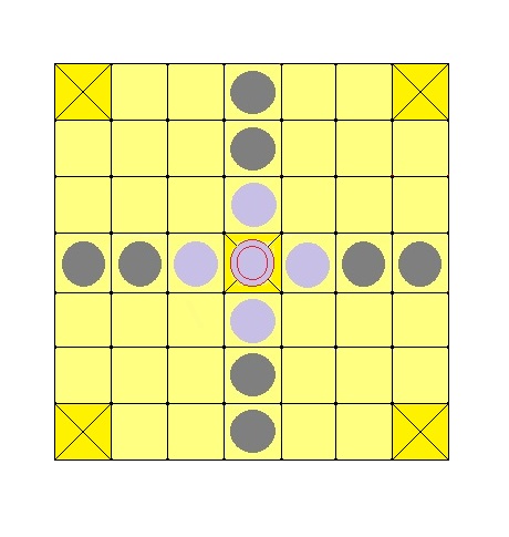 駒の構成がアンバランスで、目的も異なる2人用のゲーム。 盤は7×7で、攻撃側の駒は8個、防御側は王1個、兵8個の計9個。 交互に一つずつ駒を動かす。駒は縦横に複数マス動ける。駒を飛び越すことはできない。