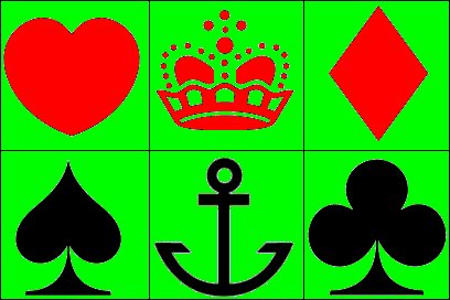 ハート、スペード、ダイヤ、クラブと錨と冠が描かれ、独楽のように心棒のついたダイス。 この6種類が描かれた盤の上に賭け金を置き、ダイスを回して当たった者が賭け金を取る。
