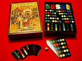 | 概要 | 5種類の宝石チップと、交換比率カード、得点カードが入っている。交換比率カードは 例えば「赤白=黄緑」「青青白=赤黄」のように交換内容が5種類書かれている。得点 カードは5つの宝石の色が書かれている。他にダイスが入っており、ダイスの5つの面 は宝石の色、残り1面はワイルドになっている。 プレイヤーはダイスを振って宝石を1個もらえ、交換比率カードの内容によって別な 宝石に替えることができる。また自分の持っている宝石5個が得点カードの宝石と一 致していれば得点カードを取ることができる。取った得点カードの得点がもっとも高い プレイヤーの勝ち。 |
