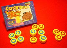 ボードの無い駒だけの2人ゲーム。交互に駒を置き、先に自分の駒を3つ表にした方が勝ち。 駒は重ねることが出来る。重ねると下がなんだかわからなくなり間違えるのが面白い。