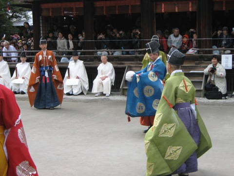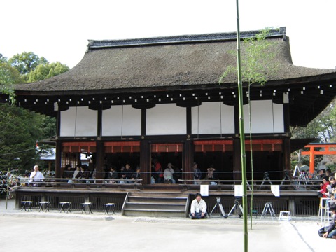さて会場の毬庭にはまだ誰もいないのだが、周囲は数百人の観客が集まっているため、宮司らしきおじさんがマイクで解説を開始。飽きさせないためだろうか、ありがたい心遣い。毬の話や下鴨神社の話など、えんえんとつなぐ。一時間ほど話したところで、さすがに疲れたか「この辺で少し休ませていただきます。」とマイクを置き、しばしの静寂。