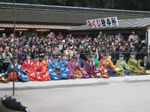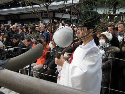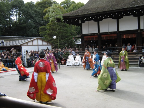 京都市の下鴨神社で1月4日に行われる行事。蹴鞠保存会による解説と実演がある。新春の京都。寺社の多い町だけに大変な混雑である。4日、地下鉄の終点で降り、下鴨神社へ。入り口はすぐにわかったが、参道の長いこと。うっそうとした林を抜け、大きな門が待ち受けてくれる。くぐると、大きな広場。しかし周囲には三重、四重の人垣。まだ一時間前だというのに、これはキツイ。とても写真は撮れそうもない。広場の一方は拝殿、もう一方はやはり有料の観覧席。いったいいくらぐらいするのかな、と席の入り口に回り、切符を切っている巫女さんに聞いて見ると2000円とのこと。たかだか高さ1mほどの高さに良い値段をつけるな、と思ったが、あと一時間立って待つ上に、蹴鞠の間も立ち続け、よい画像が撮れないとなると、この2000円高く思えないから不思議だ。切符売り場に行って2000円を払い、先程の巫女さんの元へ戻り観覧席へ。一番前が取れないと撮影しづらいので前の方は・・・・とさがして見ると、運よく一番角のところが空いている。「はい、ごめんなさいよ」と少々図々しく角に収まる。後ろの方で誰かが、そこは席じゃないだろう、とムッとしていると思われるが心の中でスミマセン。もっともその後、私と後のおじさんの間の足ひとつ分ぐらいの空間に入り込んできたおじさんがいたが、さすがにこんな真似ができるほど私は厚顔無恥ではない。後のおじさん、これには頭が来たらしく後ろのおじさんが強硬に文句。粘っていた新規参入のおじさんだったが、警備員の「立っていてはいけません。手摺りに座ってもいけません。」に諦めてスゴスゴ退散。
