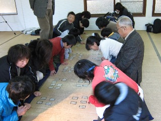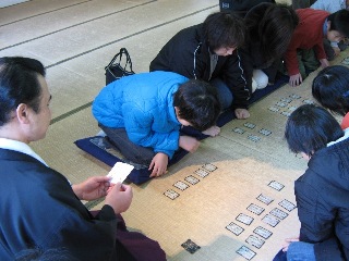 遊び方は源平とちらしの2種類。百人一首かるたと同様に、源平は二手に分かれて、ちらしは丸くなって行います。一般のかるたと異なるのは、他の人が取ったものでも取り上げて良いこと。取った札を座布団の下に入れて初めて取ったことになるそうです。元々武士の遊びだったため、戦いを模しているから最後までわからないのだそうです。朝10時開始。枚数が148枚ですし、読み札が漢詩で取り札に読み仮名が振っていないとあって、なかなか取れません。読み手の宮司さんが「○編に○という字だよ〜」というヒントを出して、やっと取れたりします。終わると枚数を申告して終了。向かい合う源平戦を2回目行い、3回目は丸くなってちらし取り。それが終わると、いったん休憩してお昼です。みんなで仲良くうどんを戴きました。 (2009. 1. 5)