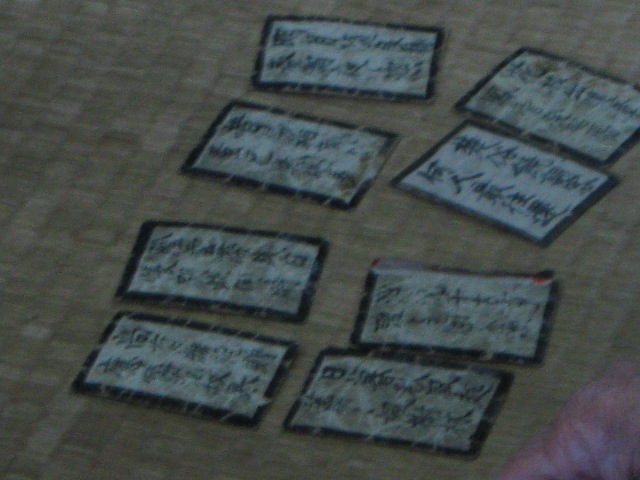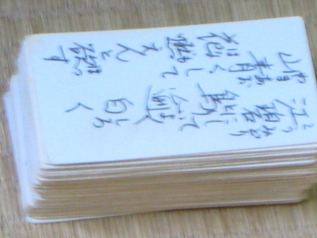 三重県桑名市に伝わる伝承遊戯。唐詩選の五言絶句(1行に漢字5文字で4行からなる詩)74編を選び、1編を2行ずつに分け、計148枚のかるたにしてあります。読み札は書き下し文になっていますが、取り札は漢字しか書かれていません。江戸時代、桑名藩の子弟たちの間で行われ、明治以降は大人たちも行っていたそうです。昨今は何人かの小学生が行うくらいということで毎年1月5日に行っているそうです。