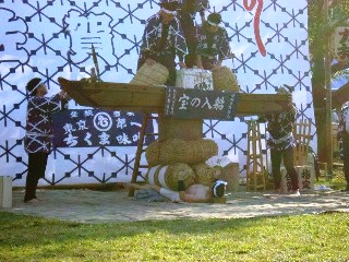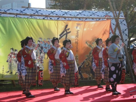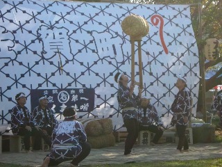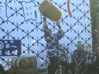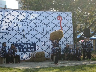 江東区木場。毎年秋に江東区の市民祭りが行なわれるのですが、この中で行われるのが伝統芸能、深川の力持ちです。 力持ちは、重いものを持ち上げ、その力量を比べ合うもので、日本各地にあります。持ち上げるのはだいたい石か餅で、神社仏閣にはこれに使用した「力石」なるものが置いてあったりします。深川の力持ちは、元々は男たちの力比べから始まったものと思われますが、次第に力を見せる芸能と化しました。まずは米俵の持ち上げ。単に上げるだけから始まり、片手で差し上げたり、回したり。あるいは2人でパスしたり。入れ替わり立ち替わり、色々な持ち上げ方で力を示します。クライマックスは地面に寝た人間の腹の上に臼を置いて餅を搗くパフォーマンス。そしてその上に船を載せ、さらにその上に人間が3人載って米俵を持ち上げるという豪快な出し物で幕となりました。