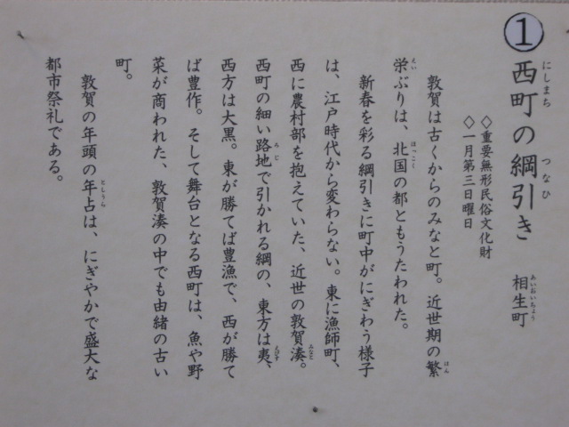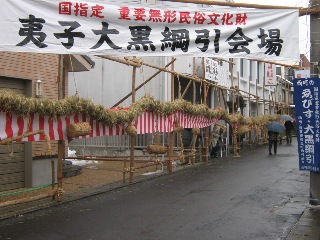 綱引きは行事として全国的に行なわれている。中でも小正月に綱引きを行なうところは多い。福井県敦賀市では、西町の夷子大黒綱引きというものが行なわれている。夷子と大黒に分かれて綱引きをし、豊作豊漁を占うとのことである。 2010年1月。記録的な大雪が吹き荒れたが、幸い、朝には収まっていた。