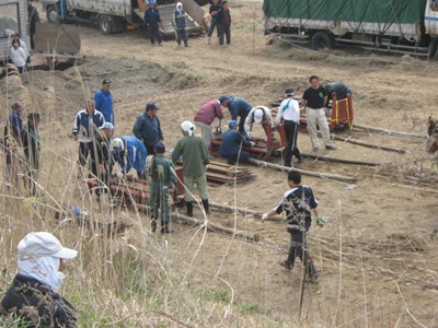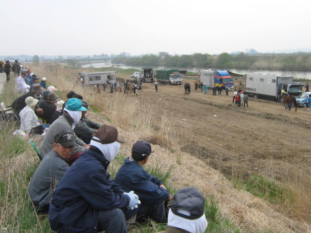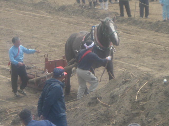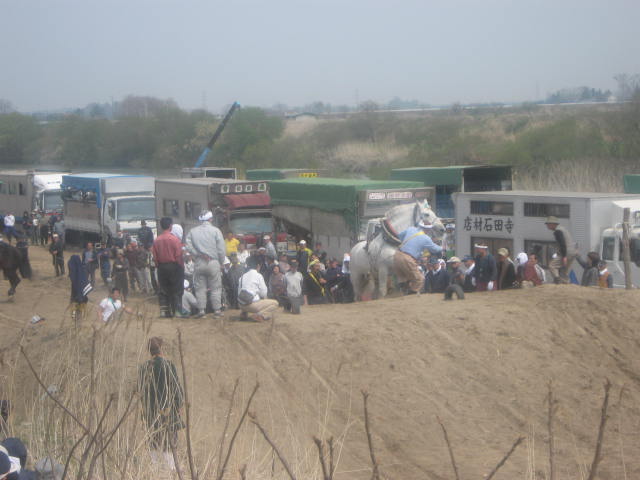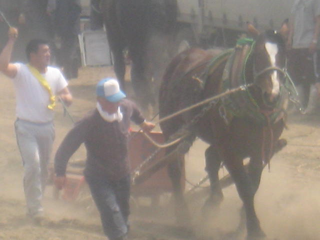 馬に重い荷が乗ったソリを曳かせて競走する遊戯は主に北海道と東北地方で行われている。 北海道ではばんえい競馬、またはばん馬と呼ばれ、東北では曳き馬や馬力と呼ばれている。馬券を発行して通年で開催しているのは、現在では北海道の十勝だけとなり、その他は年に一日だけの祭事である。北海道、東北ともに10ヶ所ぐらい行われているが、その一つの東北馬力大会が青森県の六戸町で行われた。六戸町は東北本線の三沢駅からバスで約20分ほど。広い町なので停留所を一つ間違えると大変である。奥入瀬川むつみ河川公園というところだというので、川を目指して歩く。 橋の上から見ると、遠くの方で人が集まっているのが見えた。たぶんあそこだろうと歩いてみると、はたして馬力大会は行われていた。場所は常設ではなく、この日だけ河川敷に特設会場が作られる。長さ200m、途中に3mほどの高さの山を設けた砂地のコースである。河川敷には馬を運べる特殊なトラックが何台も停まっていた。