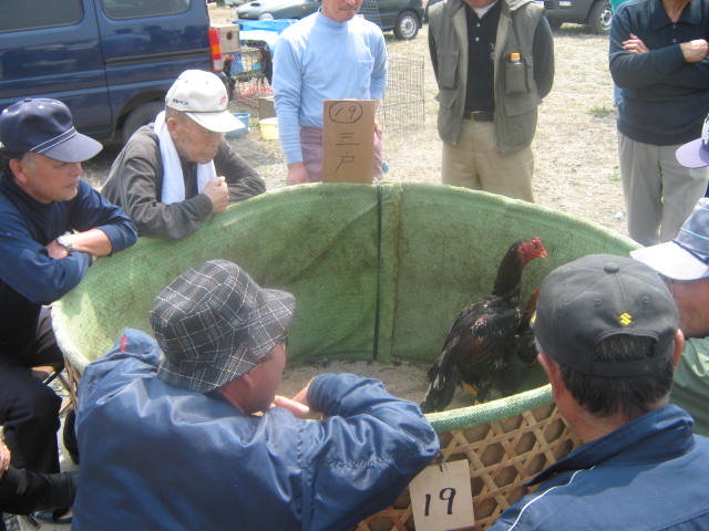 主催の六戸中央闘鶏愛好会の人に聞いてみると、北東北の愛好会が集まって北奥羽軍鶏闘技連盟が組織されており、同連盟の主催する大会は4月から8月の間に年に13回行われるが、本拠地であるこの六戸の大会が最も大きいということであった。軍鶏は国内各地の産地から購入し、近くにある鶏の孵化場を借りる者もいるし、自宅に設備のある者は自宅で孵化させるとのことであった。