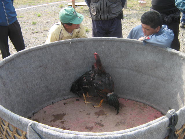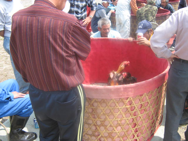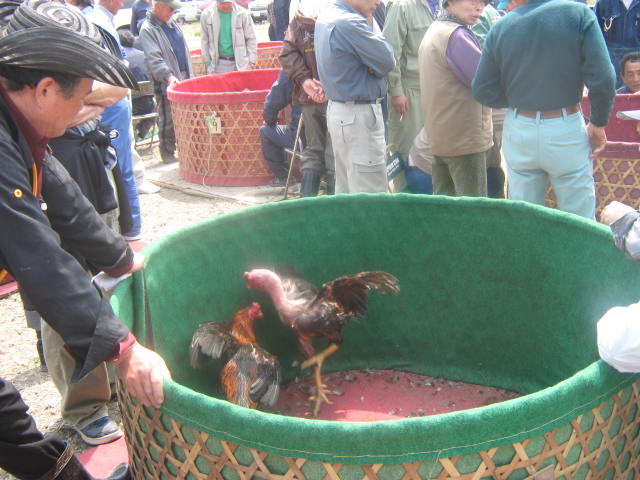 掲示板を見直してみると、結果が出たところでは10分台から50分台まで様々で「分け」も何件か出ていた。1時間たっても勝負がつかないことは、稀ではないようである。取り組みはほぼ150組。トーナメントのように、勝ったから上へ行く、というような対戦ではなく、すべて一試合ずつであったが、後で聞いたところ鶏が元気な場合、新たに参加料を払って取り組ませる鶏主もいるということである。一試合は60分と、とにかく長い。さすがに行事と鶏主以外は一つの土俵を見続ける者はいない。夕方前に取り組みを終えて閉会となったが、表彰式兼閉会式が行われた。表彰と言うのは、決着までの時間で決まり、短いものと長いものの上位3名ずつが名前を呼ばれ飼い主に賞品が授与された。長いというのは、制限時間ぎりぎりで決着がついたものである。