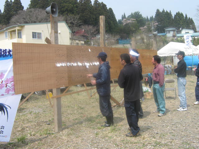 会場の一角には3張りのテントが立てられている、一つは受付、一つは賞品置き場になっており、もう一つでは食品が売られていた。近辺に食事のできるところがないので設けられているのだった。テント横には板塀が立てられ、協議事項が貼られていた。
