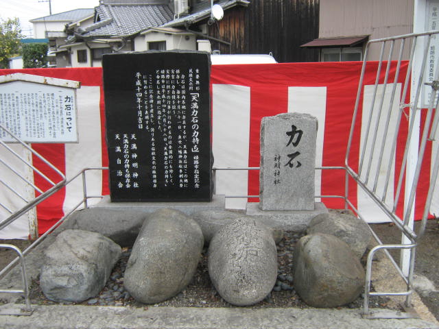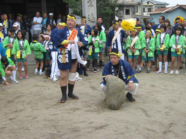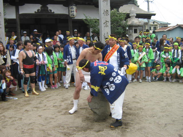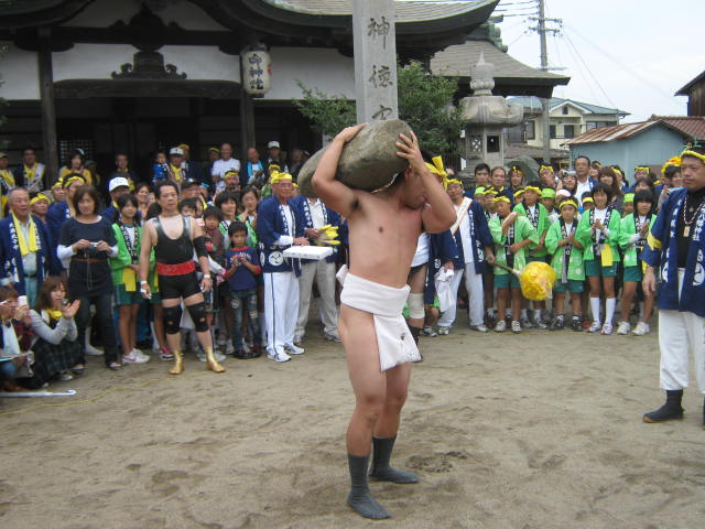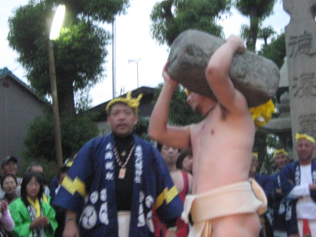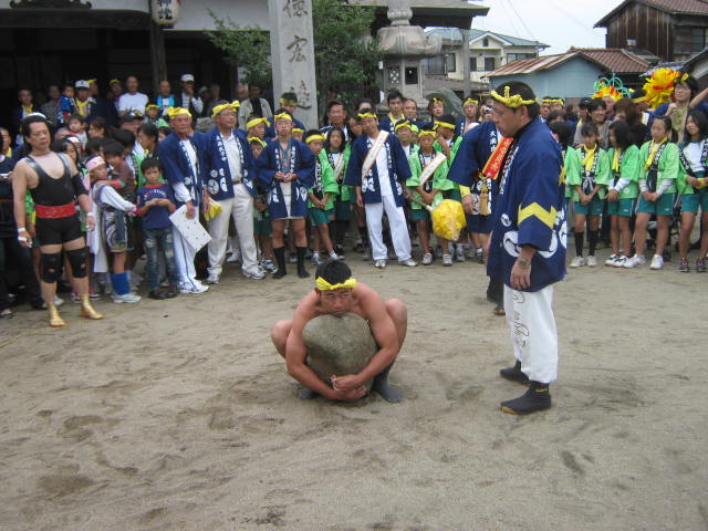 今日は姫路市大津区天満地区のお祭り。魚吹(うすき)八幡神社の祭礼なのですが、同じ地区内の蛭子神社と神明神社で力石持ち上げがありました。力石は男たちの力試しに用いられたようで、蛭子神社には3個、神明神社には7個あり、一部は江戸時代のもので市の文化財となっています。今日は宵宮で屋台引き回しがあったあと、それぞれ10人ぐらいが持ち上げに挑戦しました。石の重さは60〜70kgでしょうか。肩に担ぎ上げるのに成功したのはどちらも3人程度で、持ち上がると周囲から喝采が起こりました。
