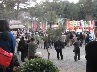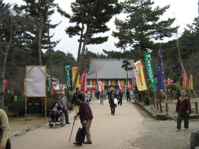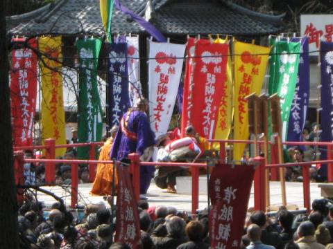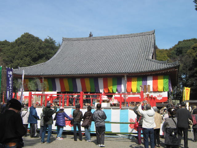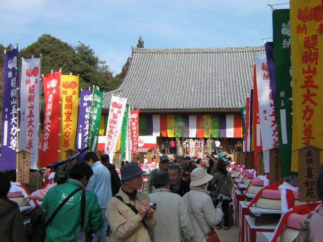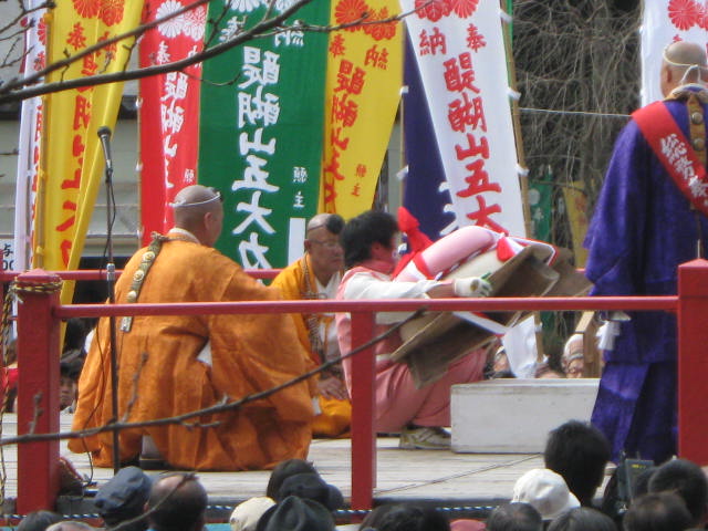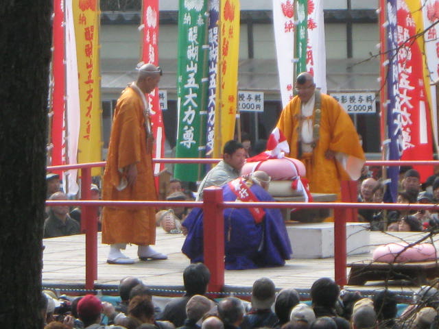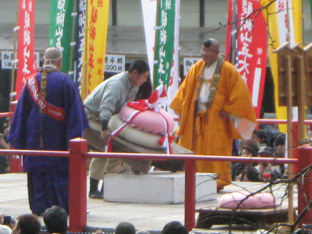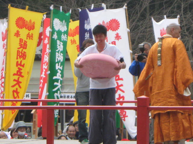 まず正午から女性の部。今年の参加者は20数人。三方自体が高さ20〜30cmの台の上に乗っており、その三方ごと持ち上げなければならないため、普通に引き上げるわけにはいけない。腰を落として三方を腰まで引きよせ、横の中央近くを持ち、お尻がつきそうになるくらいまで腰を落として持ち上げるのである。持ち上げることもできない人が2〜3割だろうか。半分ぐらいが1分もたない。横でマイクを持ったお坊さんが名前を聞き、時間を読み上げる。3分を超えると会場を取り囲んだ群衆から拍手が起きる。何人目かの女性が「5分」の声を聞いて三方を下した。力が抜けるのだろう。この日はピンクのジャージを着た若い女性が10分というこれまでの記録を1分以上更新する新記録で優勝。会場を大いに沸かした。後から聞けば新聞社の記者で、以前にこのイベントの取材をしたのが契機で、専門の道場に通って鍛えたとか。確かに同じ形で重さのもので練習しなければ記録は難しそうである。
