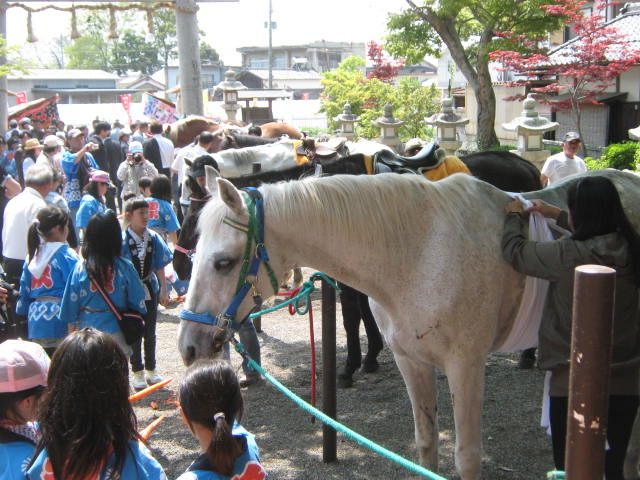 午後1時頃、神社に行ってみるとちょうど、近くに家から裃姿の若い男性が馬に乗って家を出る所で、多くの人がその出発を見送っていました。今年の乗り手なのでしょう。神社に着くとすでに4,5頭の馬が繋がれて出番を待っていました。