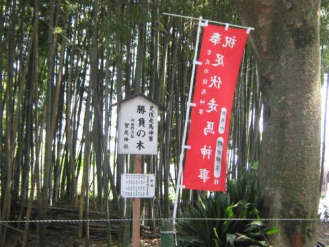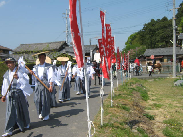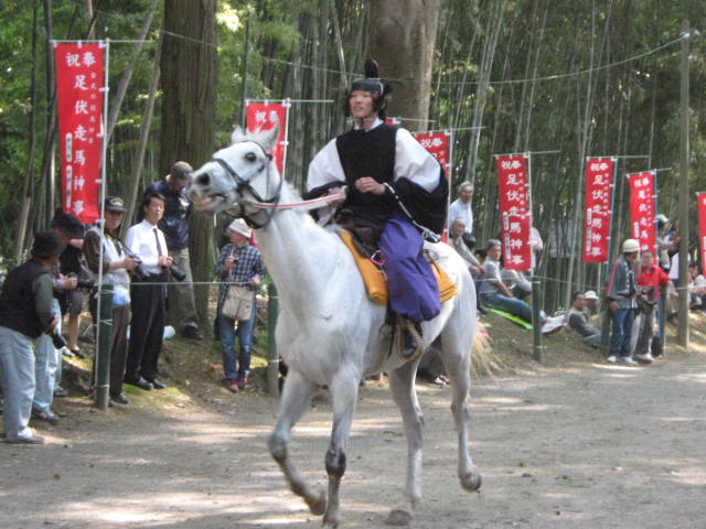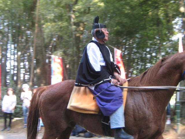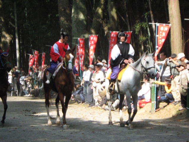 神社では、拝礼や雅楽の演奏が行われ、2時頃に行列が出発。宮司、馬、子供神輿などが町内を一周します。馬場は直線にして400mほど。両側が森になっており荘厳な感じがします。3時から競馬が始まりますが、慣らしのために何往復かします。サラブレッド風の精悍な馬もいればずんぐりむっくりの農耕馬風の馬もいます。後者の方が声援が大きいようです。乗り手は3人は狩衣に烏帽子においかけという姿でしたが、他はトレーナー姿で