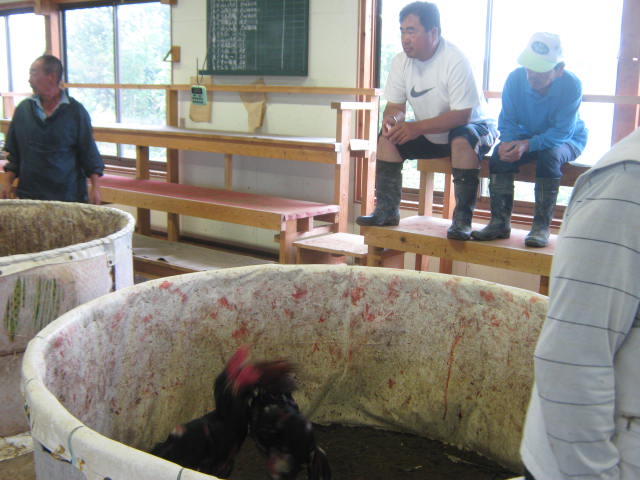 実態を知らない人間は、動物同士の闘いを残酷と感じ、虐待しているというイメージを抱いているかもしれませんが、闘鶏の愛好家は皆自分の軍鶏を可愛がっています。終われば水で洗い、けがをした部分に薬を塗ります。闘えるのは一定の年齢の間だけなので、過ぎれば食用になるのはやむを得ないのでしょうけど。