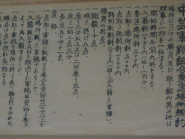 壁にはこの軍鶏組合の規則が張られていますが、専門の用語があるので少しわかりにくい。だいたいは費用と参加方法や勝敗の決定方法のようです。7ヶ月が一場所となっており軍鶏は闘いを行うごとに点数が与えられます。勝った場合は勝ち方によって点数が入り、引き分けの場合は時間が点数化されます。これが累積されていき、6月最終週には上位同士による決勝戦となります。通常の試合は40分から60分で、これは飼い主の申告との事でした。決勝戦は90分で行われるそうです。