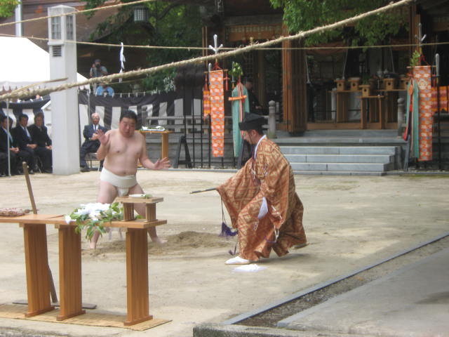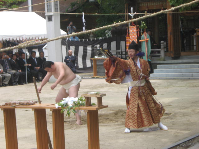 愛媛県今治市、ではありますが瀬戸内海に浮かぶ大三島。そこにある大山祇(おおやまずみ)神社の春秋の祭礼で行われるのが一人角力(ひとりすもう)です。慣用句では一人で勝手な事をする意味ですが、ここでは人間が精霊と相撲を取る事を言います。精霊は人間の目に見えないので、一人で相撲を取っているように見えるわけです。というか、見えるように相撲を取らなければなりません。久しく耐えていた行事ですが、数年前にこの力士を務める人が見つかり、今では多くの観光客が訪れます。祭礼は様々な行事から成っており、春は田植え、秋は稲刈りが中心です。一人角力は境内に作られた土俵で行われます。力士である一力山と行事が出てきて、まず神に拝礼。続いて3番勝負となります。一力山は組み合ったり押しあったり、押されて土俵際でこらえたり、足を取られてよろめいたり、たいへんな演技力です。土俵の外に勢いよく突き飛ばされてまず一敗。再び仕切って取り組み、今度は勝ちます。3番目は土俵の上で見事にひっくり返され、精霊の二勝一敗で目出度く方策が約束されると言うわけです。 。