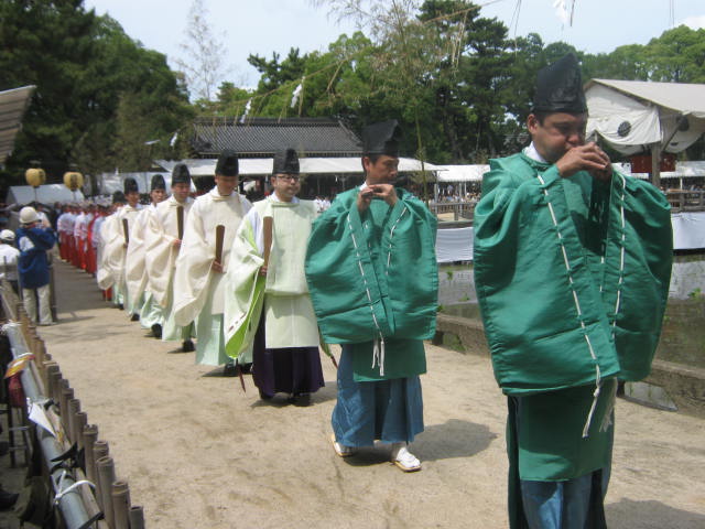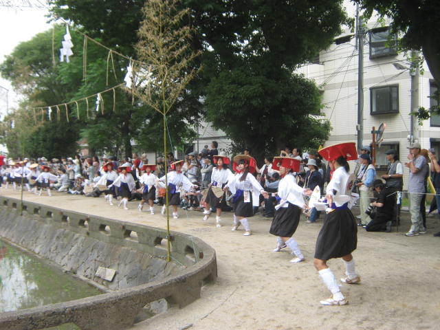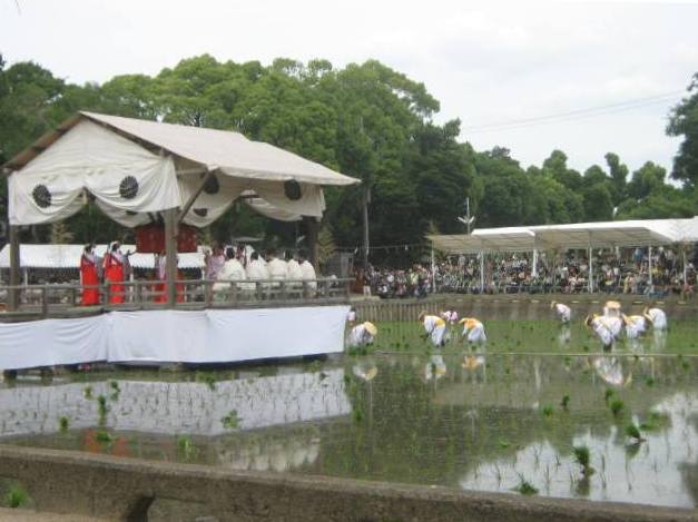 大阪府の住吉大社の「御田植神事」。能狂言等の芸能の元となった田楽を今に伝える田遊びは24件が重文指定ですが、近畿はここだけです。 行列の後、清めの水を田に注ぎ、田植えが始まります。 八人の早乙女による田舞、御田代舞、武者行事、男児による棒打ち合戦、田植踊、100人以上の少女による住吉踊りと続きます。 途絶えかけたのを大阪唯一の花街である新町の遊女が続け、今に至るそうですが、巫女=遊女=芸人説を採る私としては当然とも思える話。