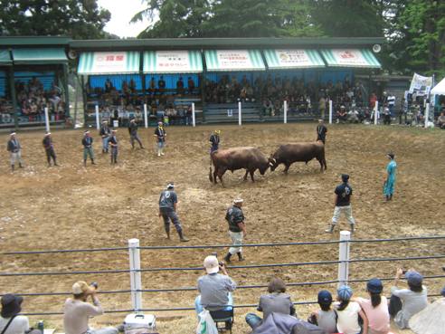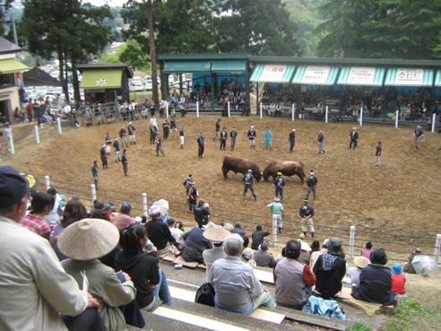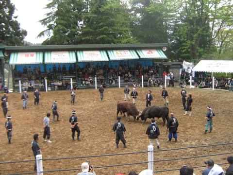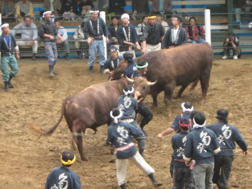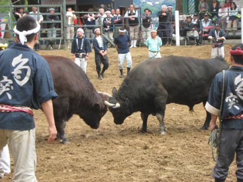 小千谷市にて年に数回の闘牛。会場の闘牛場はバスで15分ほどの山の中なのだが、バスの乗客は年寄が15人ほど。会場に着くとすでに300人ほどの観衆。今はほとんど車なんですね。闘牛は午後1時開始。午前中の雨が見事に上がりました。渡された取組表を見ると、この日の取組は25番。だいたい年齢の若い順に組まれており、初めの頃は初土俵で突き合わずに終わってしまう取り組みもありましたが、中盤以降はしっかりとぶつかり合う熱い戦いを見せてくれました。 越後の闘牛は勝敗を付けずに終わらせるのが特徴。5分ぐらいで勢子頭が手を上げ、それを合図に勢子たちが牛を引き離しにかかります。牛はやる気になっているので、これをいかにうまく大人しくさせるかが勢子の腕。雨のため地面がぬかるんでいるので足を滑らせると命にかかわることも。途中、近くの小学校の飼われていた闘牛の卒業式と言う事で、セレモニーがあり、すべての取り組みが終わったのは午後5時過ぎでした。(2012. 5. 3)